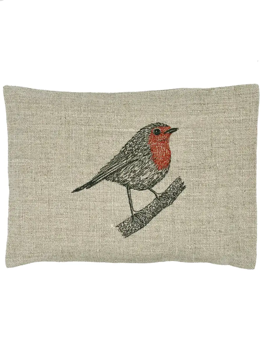 La housse est sublimée par une broderie représentant un rouge gorge délicatement posé sur une branche. Réalisé en deux couleurs de fil, son poitrail rouge orangé emblématique attire immédiatement le regard et contraste joliment avec la finesse du reste du motif. Son profil doux et rond lui donne cette expression attendrissante qui fait tout le charme de ce petit oiseau familier de nos jardins d’hiver. La précision des points de broderie capte sa posture tranquille, presque confiante, comme s’il s’était arrêté là pour un instant de repos.