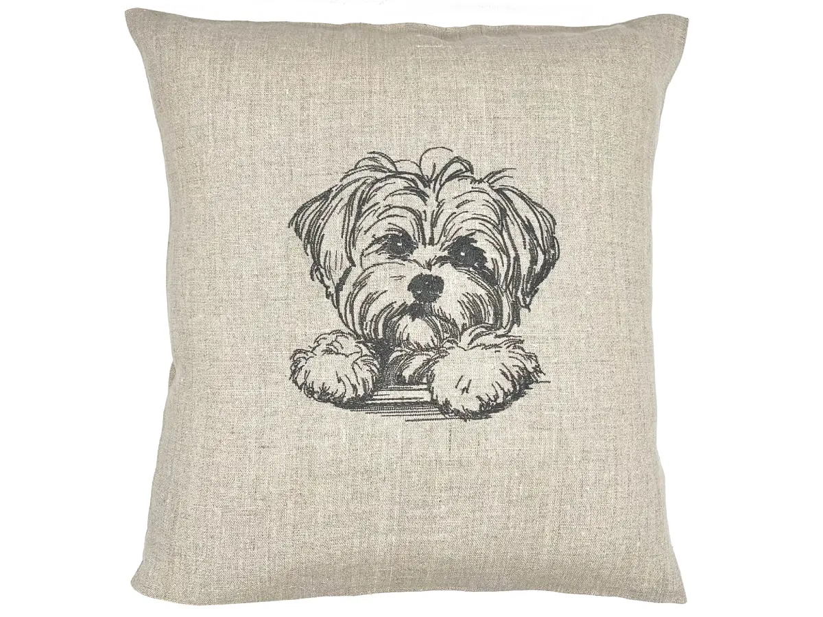 Cette coussin Bichon maltais brodé traduit parfaitement cette relation privilégiée. Le regard légèrement levé, les pattes posées comme pour attirer l’attention, évoquent un chien en attente d’un geste tendre, d’une parole douce, d’une caresse. Il y a dans ce portrait quelque chose de très vivant, presque interactif, qui donne l’impression que le chien va remuer la queue d’un instant à l’autre.