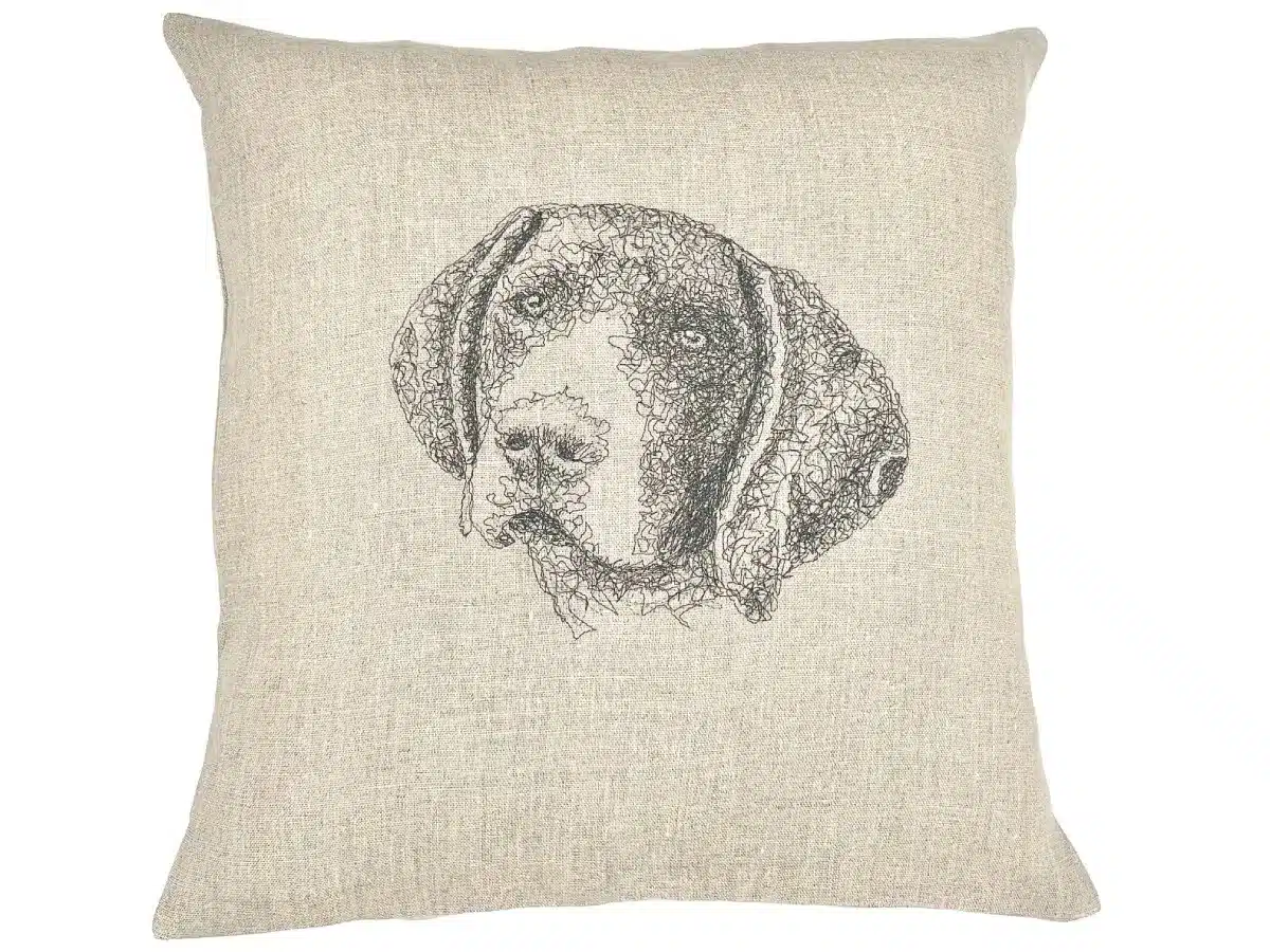 Dans ce grand portrait brodé en deux nuances de gris, le Braque allemand (ou Pointer allemand) apparaît la tête légèrement inclinée, comme s’il venait d’entendre quelque chose d’intéressant. Cette petite inclinaison donne immédiatement vie au portrait. Son regard, particulièrement doux et attentif, capte toute l’attention et apporte au dessin une expression pleine de gentillesse.