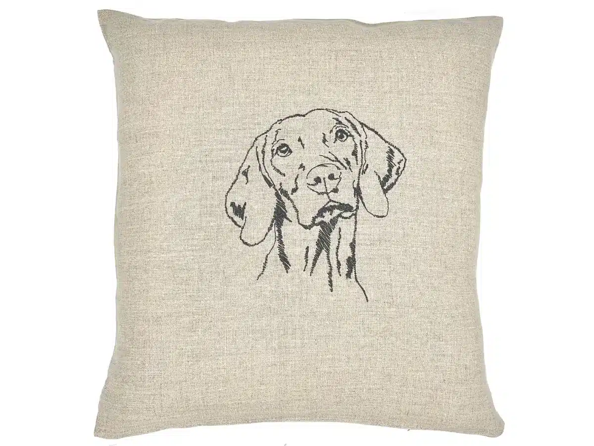 La broderie de ce coussin Braque de Weimar semble capturer toute la noblesse naturelle de ce chien d’exception. La tête vue de face, légèrement inclinée, crée immédiatement une connexion. Et ce regard levé vers le haut… c’est typiquement le regard du Braque : profond, tendre, presque velouté. Un regard qui ne fixe pas seulement — il ressent.