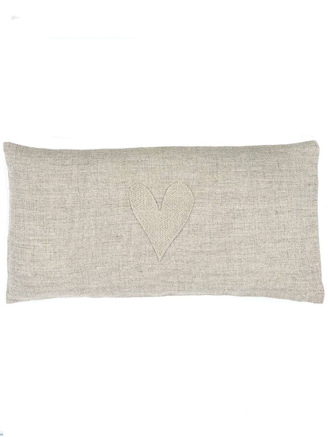 Je vous présente le coussin de relaxation Coeur bohème de ma collection de coussins de relaxation en lin brodé, garnis de fleurs de lavandin bio et de balle de petit épeautre bio.