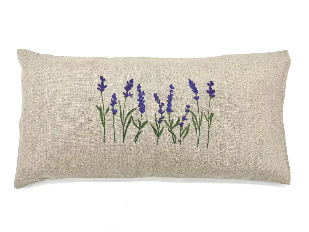 Je vous présente ma collection de coussins de relaxation en lin brodé, garnis de fleurs de lavandin bio et de balle de petit épeautre bio.