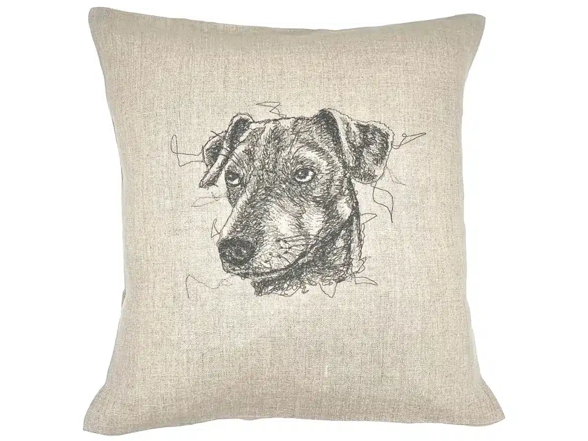 Dans ce portrait vu de trois quarts, le Jack Russell penche légèrement le museau, les yeux levés vers le haut avec cet air typique qui oscille entre innocence… et petite idée derrière la tête. Réalisée en deux fils gris, la broderie souligne la vivacité de son expression et la finesse de sa tête. Son poil court et sa silhouette nerveuse sont suggérés avec quelques traits précis, qui suffisent à évoquer toute l’énergie concentrée dans ce petit corps.
