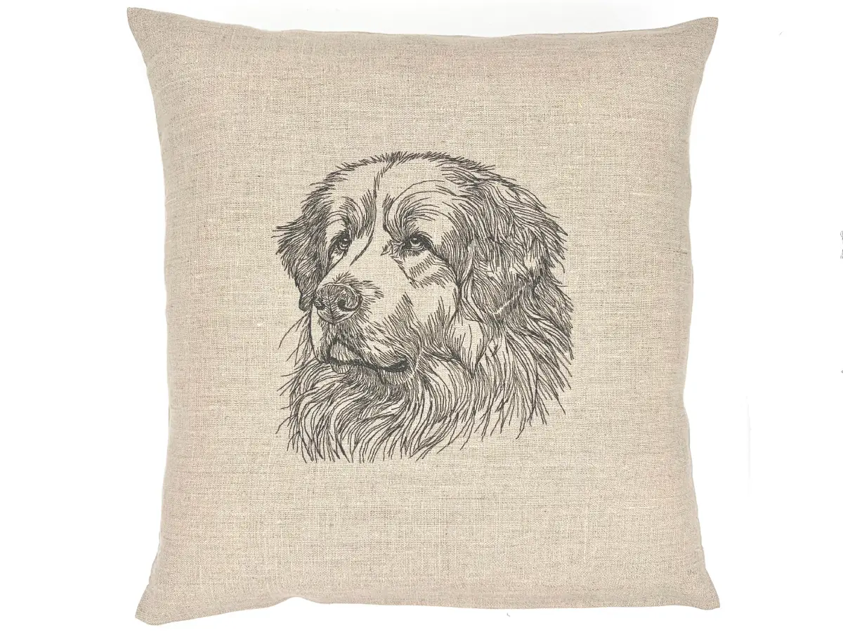 La broderie suggère avec finesse l’abondance de son pelage épais, ce manteau généreux qui fait toute la majesté de ce chien de montagne. On devine immédiatement la puissance de l’animal, sa carrure imposante et cette présence tranquille qui caractérise les grands chiens de protection.