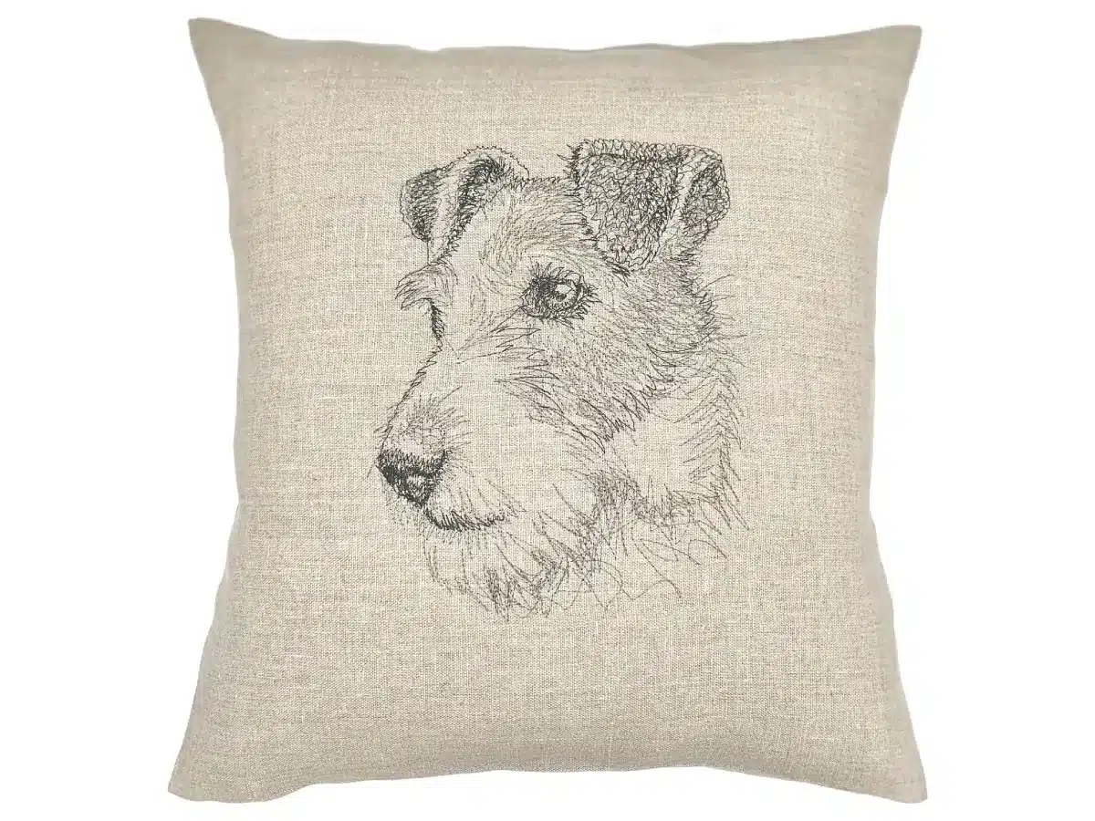 Dans ce grand portrait brodé en deux fils gris, le Parson Russell Terrier apparaît de profil, la tête bien dessinée et les oreilles délicatement repliées qui lui donnent une expression absolument irrésistible. La broderie va à l’essentiel : quelques lignes fines suffisent à révéler la vivacité de sa silhouette et surtout… ses yeux. Deux magnifiques yeux doux, presque « de biche », qui attirent immédiatement l’attention et donnent à ce portrait toute sa personnalité.