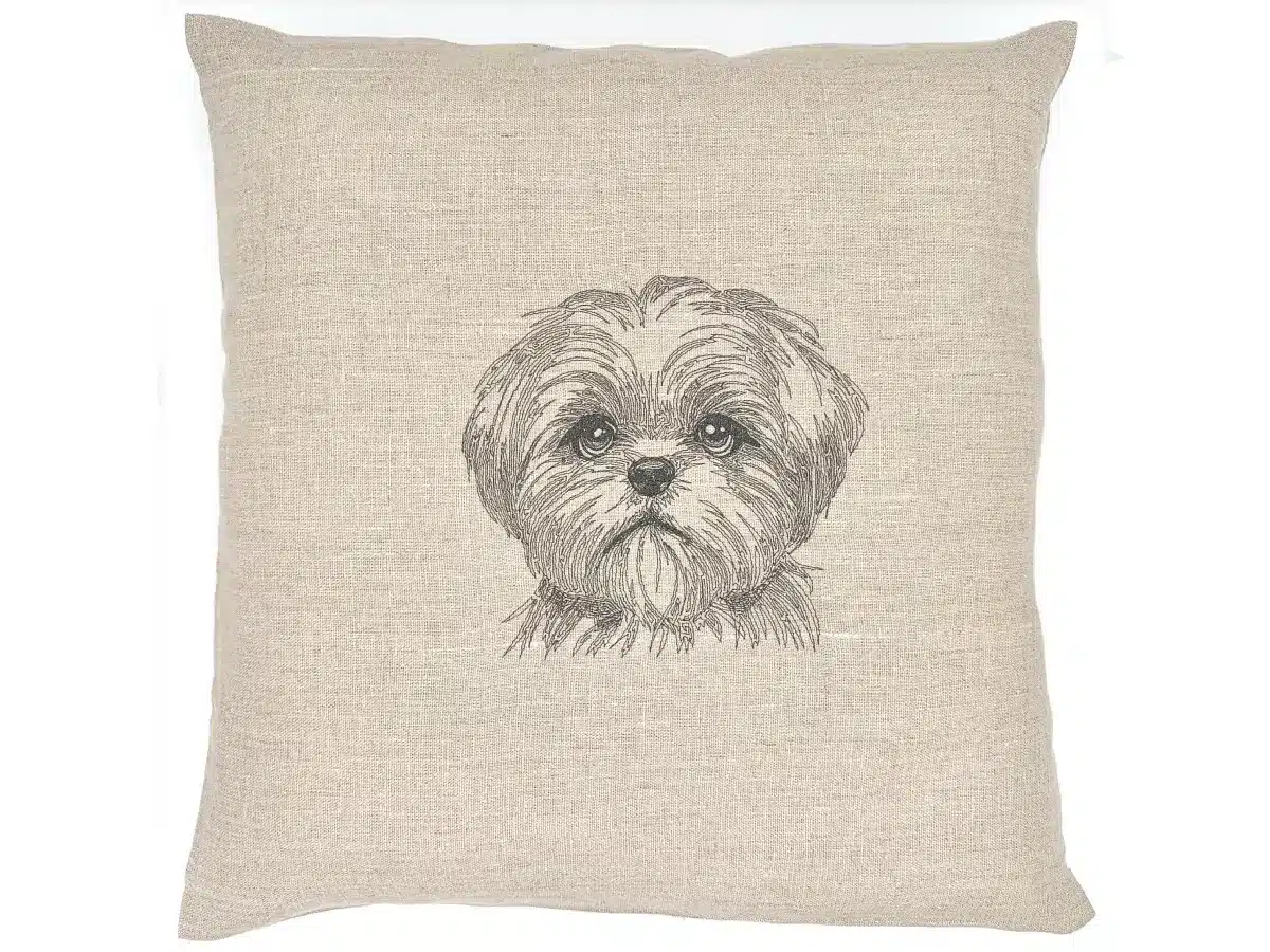 Dans ce portrait brodé en fil gris anthracite, le Shih Tzu apparaît encore tout jeune, avec cette bouille irrésistible que seuls les chiots semblent savoir maîtriser à la perfection. Vu de face, il fixe le spectateur avec deux grands yeux ronds, ouverts comme des billes. On dirait presque qu’il pose très sérieusement… comme dans un photomaton. Il manque juste le petit rideau derrière lui.