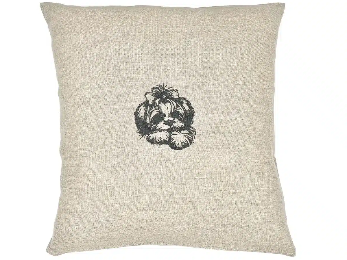 Choisir ce coussin Shih Tzu noeud, c’est donc faire le choix d’un marquage à la fois esthétique, résistant et intemporel, un savoir-faire qui traverse les années sans perdre de sa beauté. Le motif fait partie intégrante du textile. Il ne s’efface pas et ne se décolle pas.