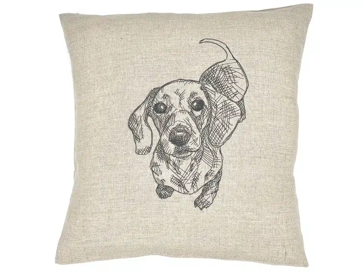 Dans ce portrait brodé, le Teckel apparaît debout sur ses quatre pattes, vu de face, dans une posture simple et pleine de charme. Le dessin, très proche d’un trait de crayon, est composé de lignes souples qui donnent au portrait une grande douceur visuelle. La broderie suggère avec finesse la silhouette allongée et les petites pattes caractéristiques de la race, tout en conservant un style léger et élégant.